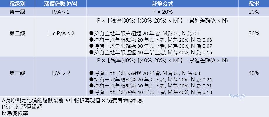 土地增值稅稅率根據土地用途分為「一般用地稅率」與「自用住宅用地稅率」兩種: