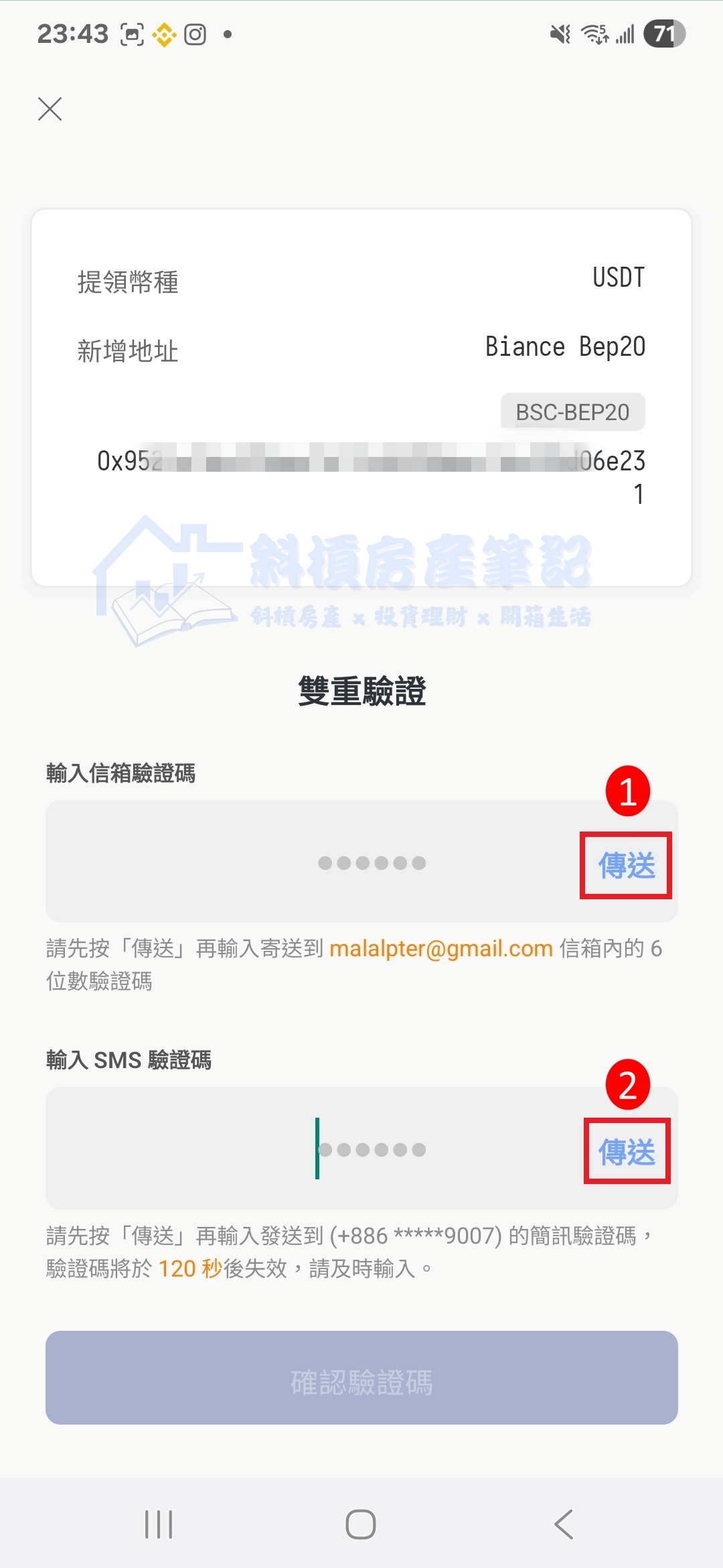 新增地址後,系統會要求雙重驗證:先輸入信箱驗證碼,再輸入簡訊驗證碼,確認無誤後才能完成新增。