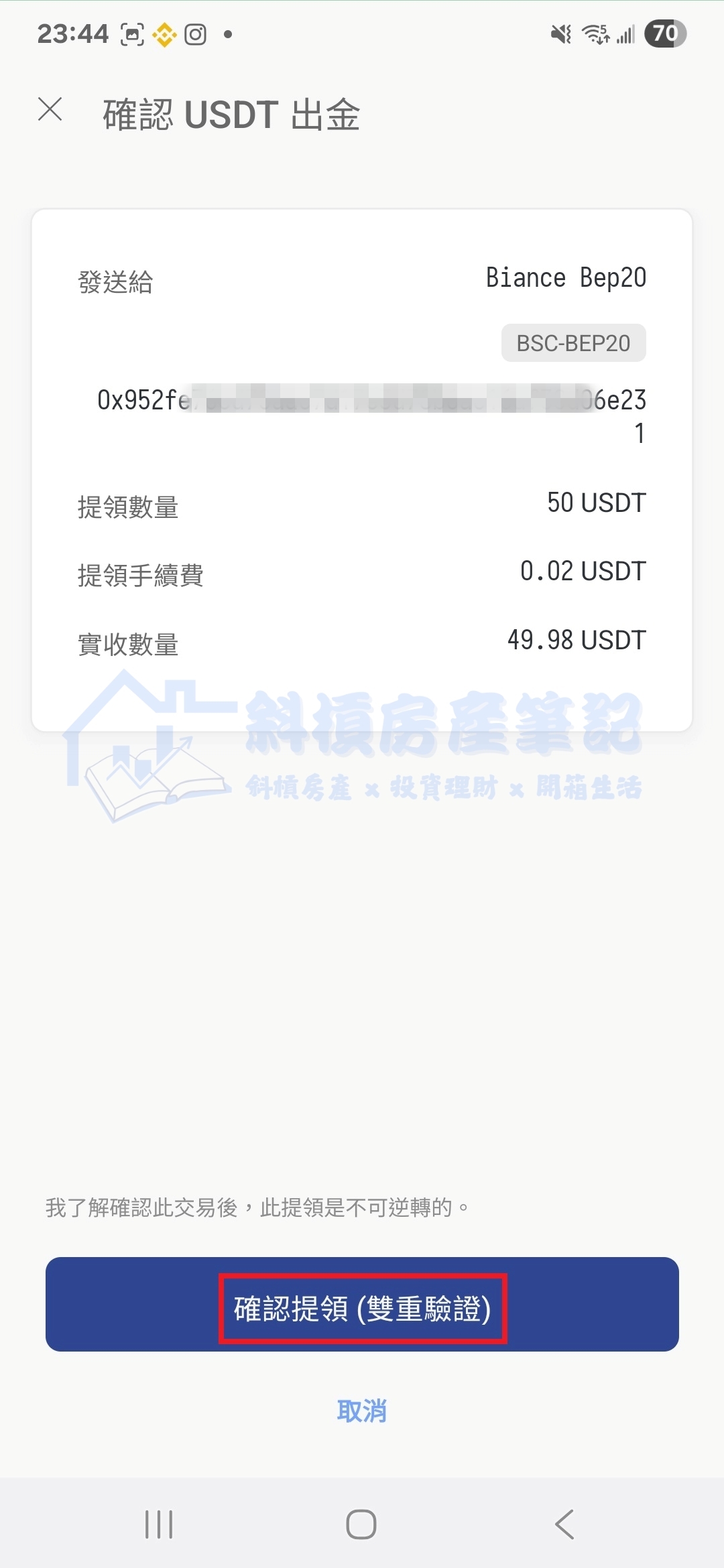 此時系統會跳出訊息,請仔細確認提領 USDT 的訂單細節。確認沒問題後,就按【確認提領】。