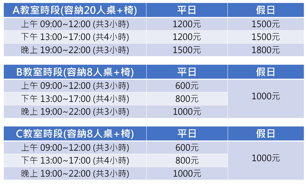 ● 連續承租兩個時段, 中間不清場, 可繼續使用.