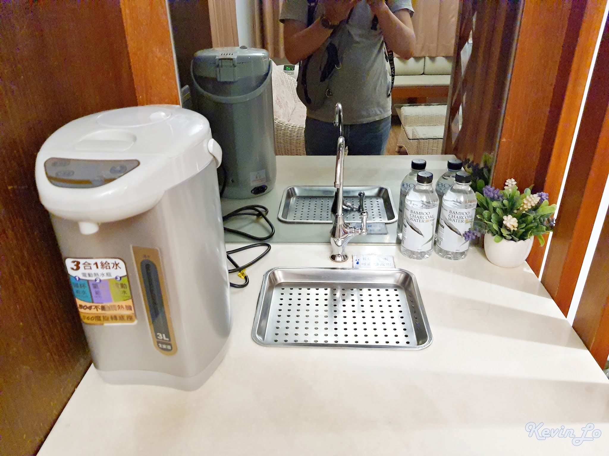 衣櫃旁的檯子擺設礦泉水與熱水壺, 也有可以直接喝的「RO純水」飲水機可以裝水, 不用擔心喝水的問題.