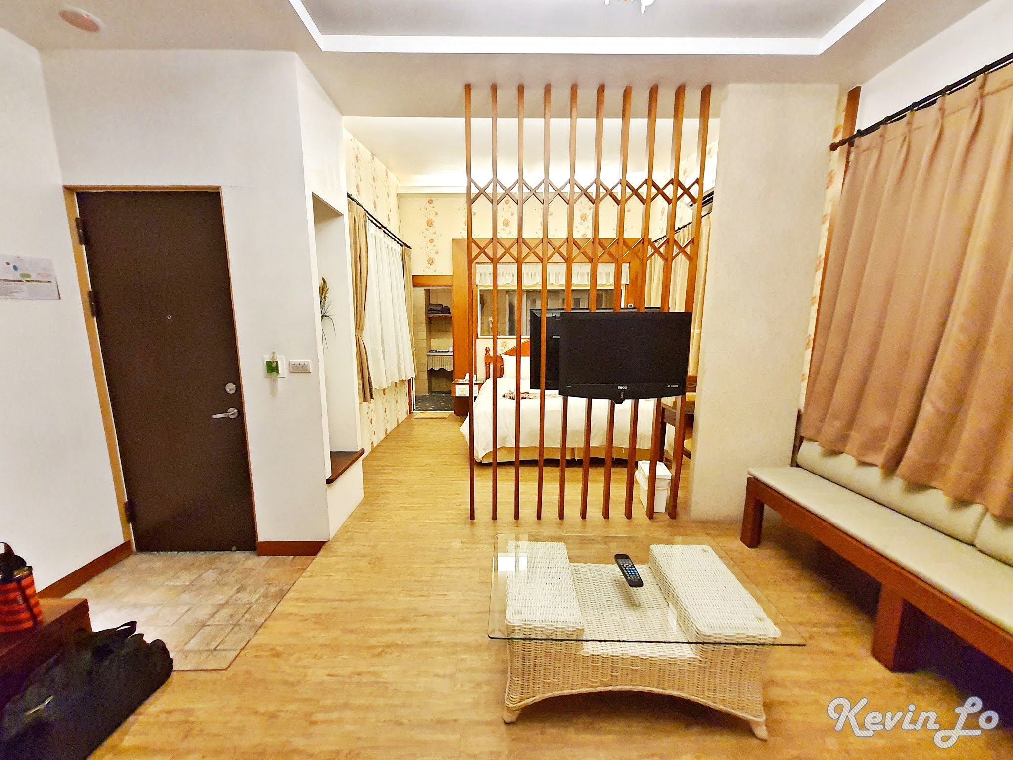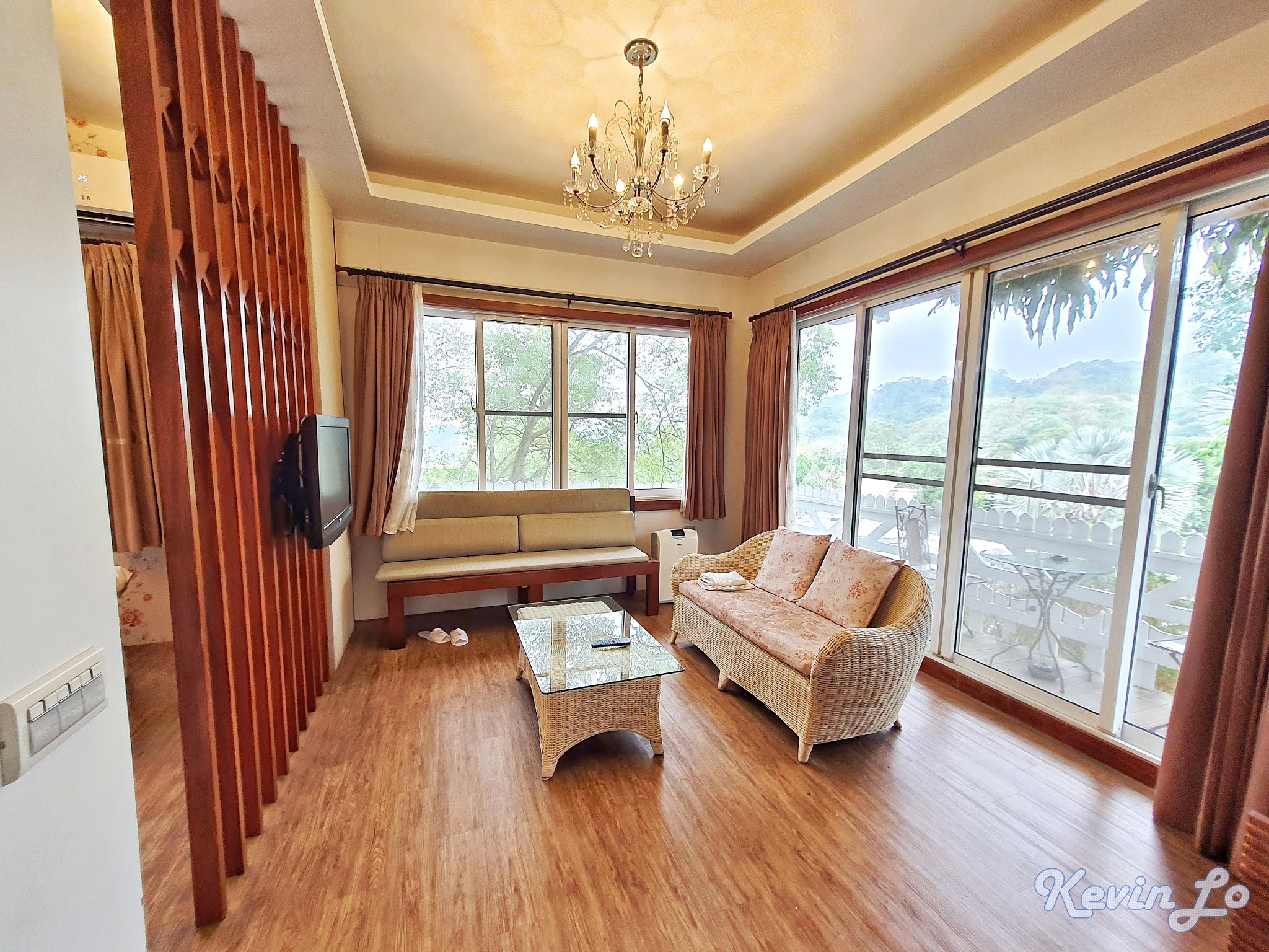 目測室內約 15 坪左右, 臥室與客廳各有一台電視, 用簡單的木柵欄區隔開來, 雖然只有兩人住, 卻可以獨享大空間的放鬆度假環境.