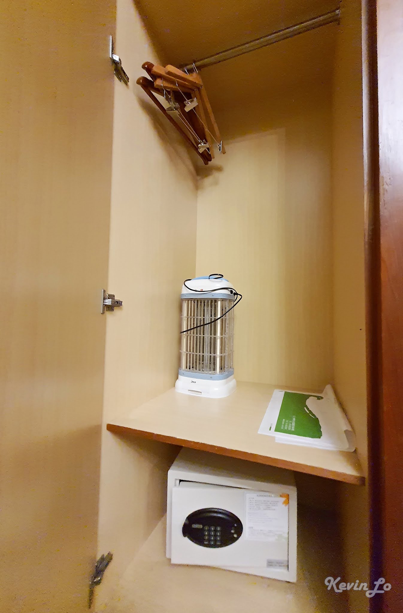 衣櫃裡頭有曬衣架、收納袋與保險箱, 有需要可自行取用.