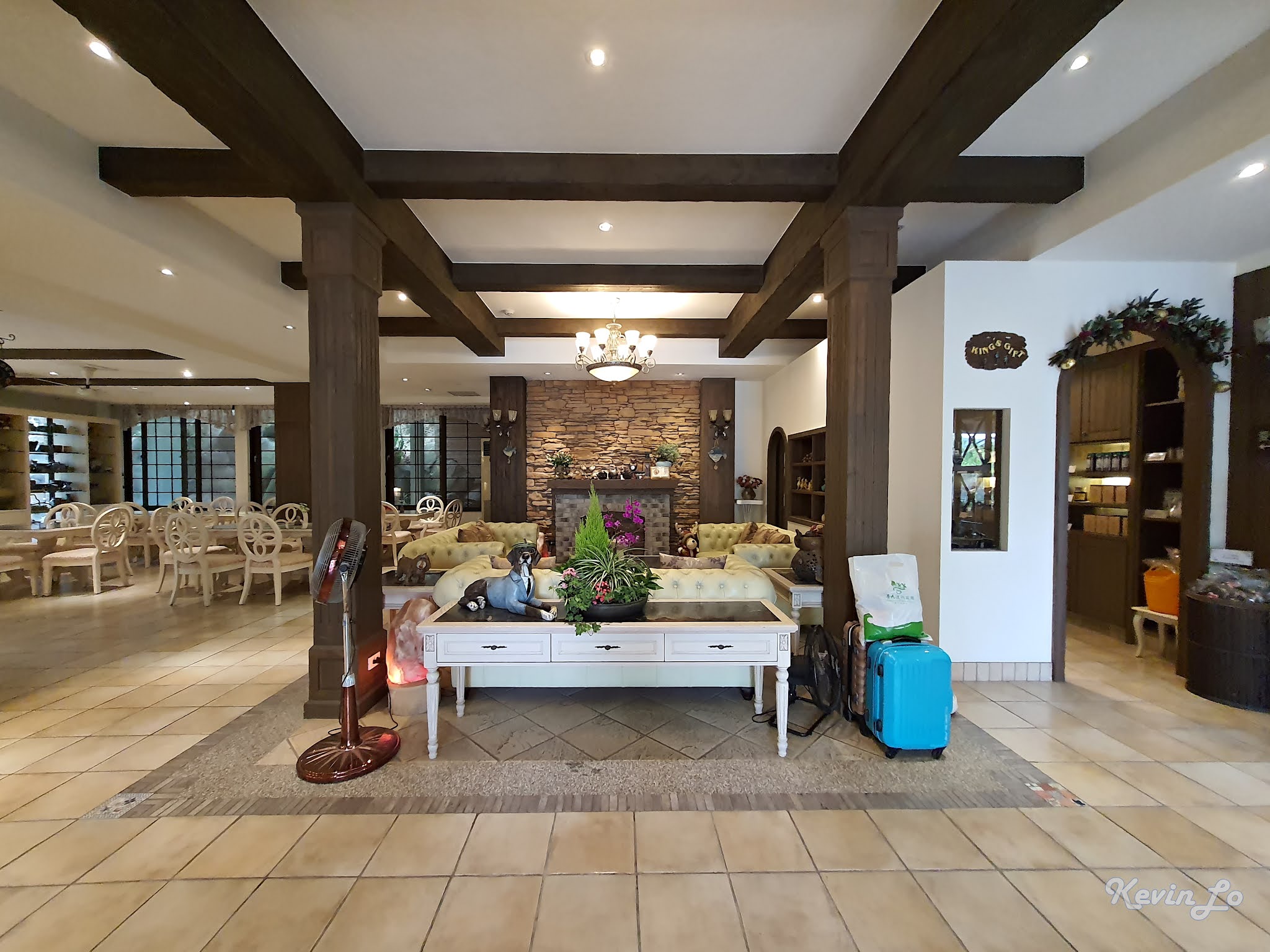 接待大廳充滿濃濃的歐洲風格, 大地色系方塊地磚、吊燈、家具與裝飾壁爐以歐式鄉村風情為主.