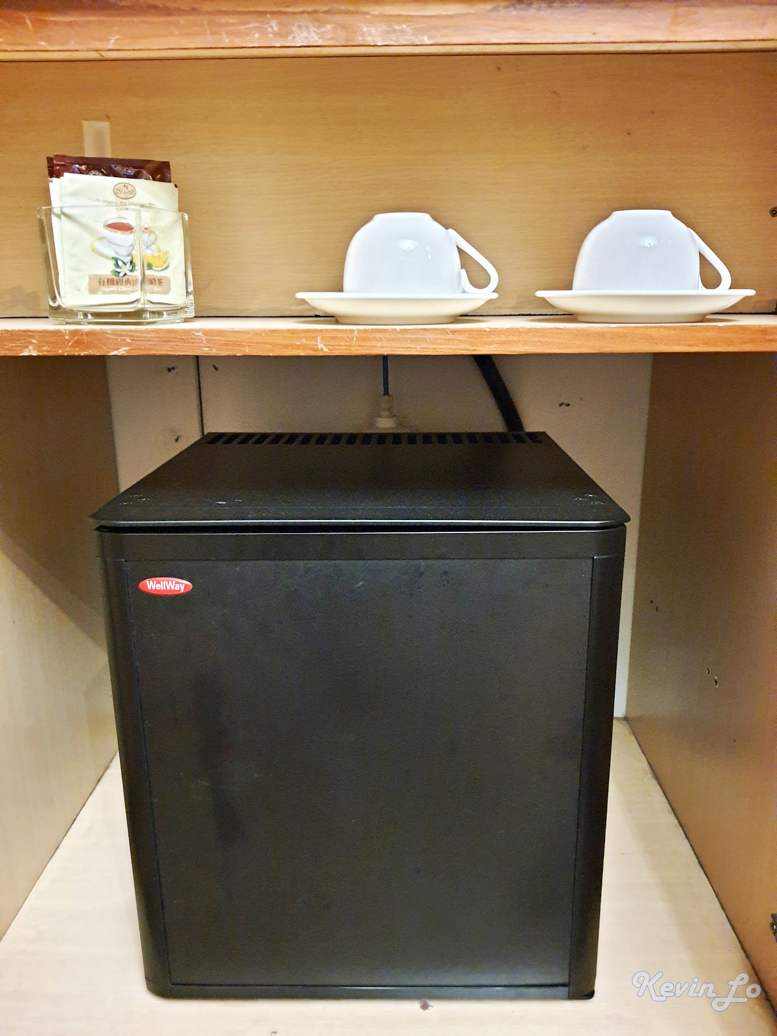 雖然櫃體看起來有點斑駁, 但維護的還算乾淨, 附有杯子、茶包、咖啡包與冰箱.