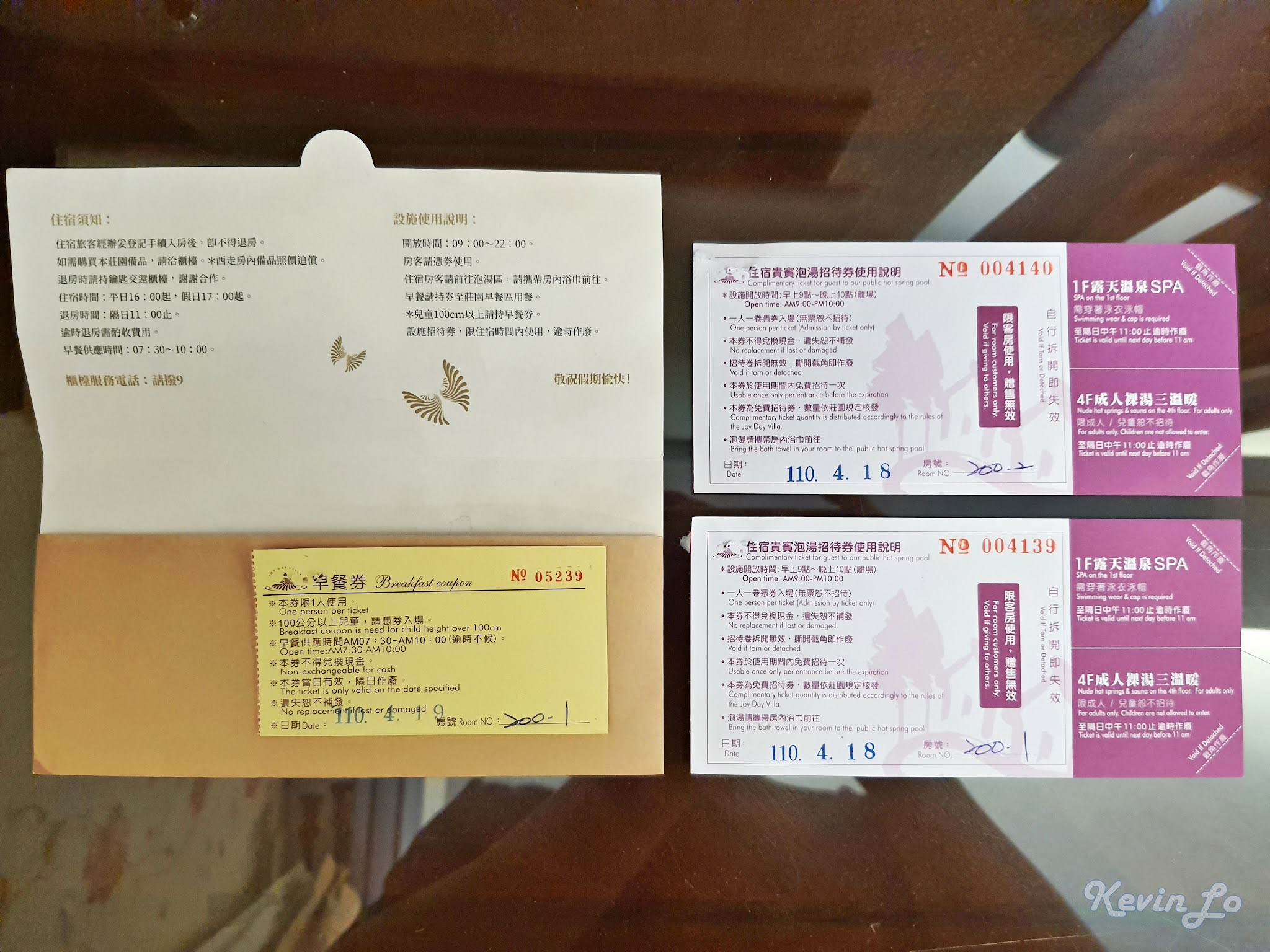 報到手續完成後, 櫃台會給你房卡、早餐卷與泡湯招待卷.