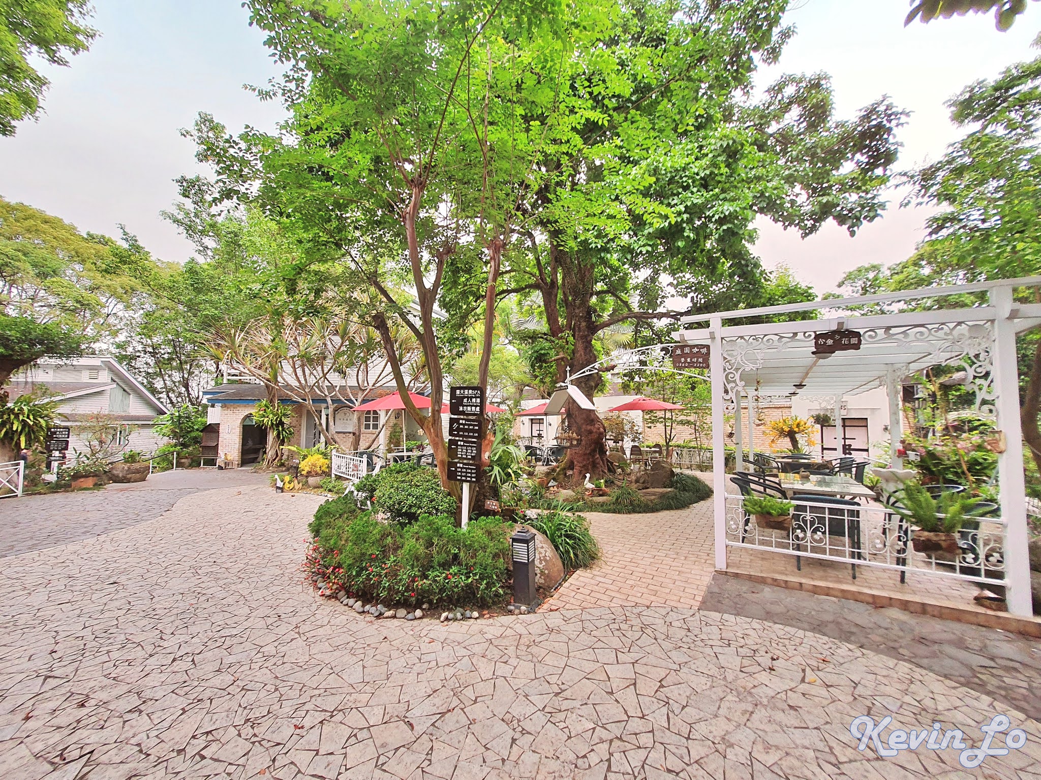 整個莊園順著地形而建、地上鋪著歐式特色地磚、灌木與喬木修剪整齊.