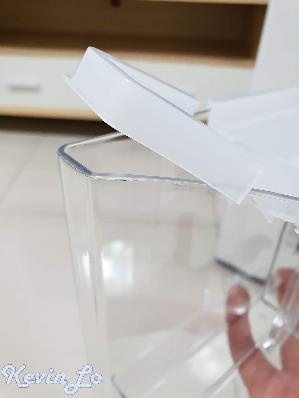 4.5L 的集水箱, 大約 6 小時可以不用倒水, 還附有把手; 另外機器背面有基本的連續出水孔, 把那個圓形蓋子敲掉後, 就能接水管連續排水.