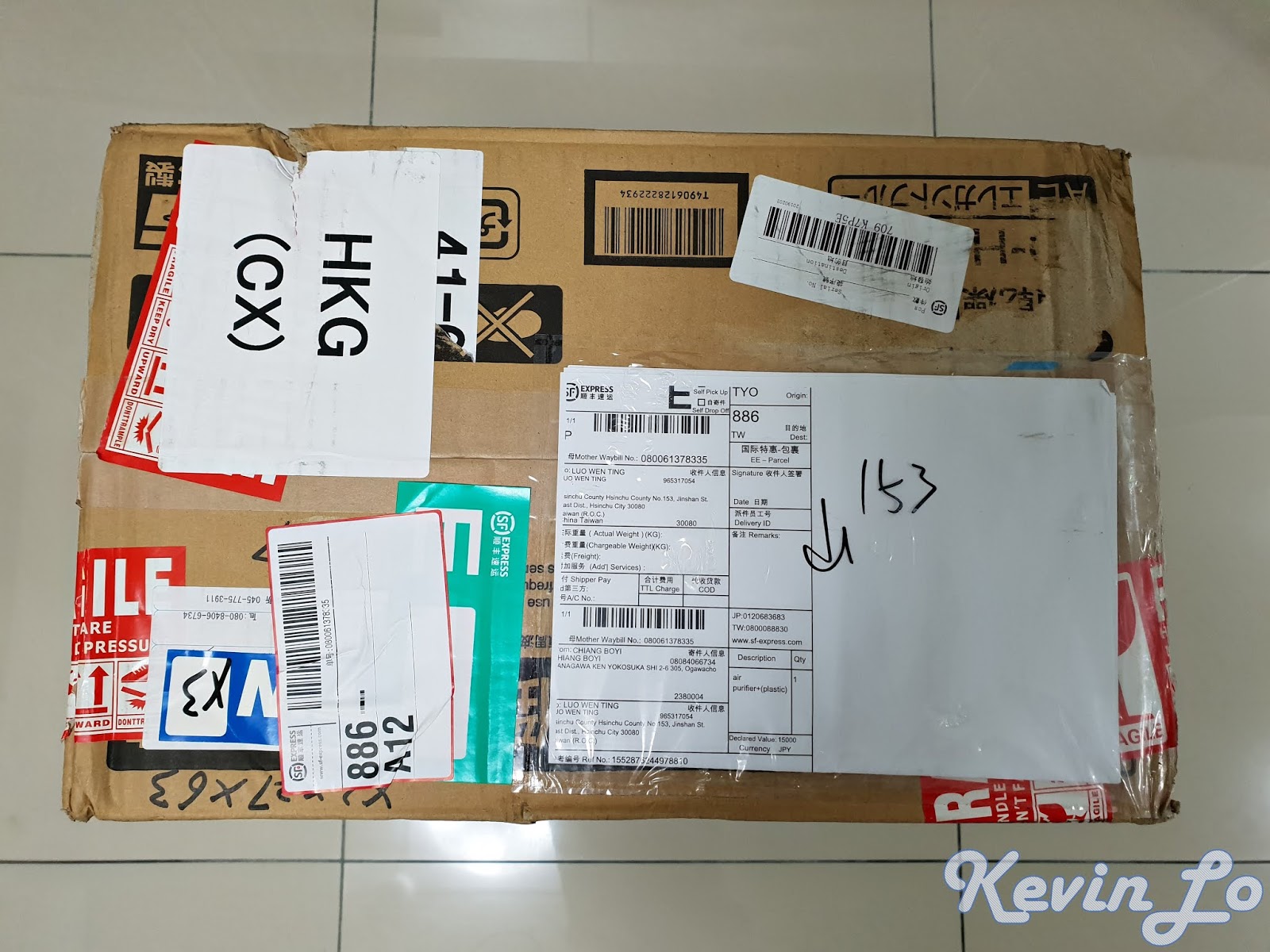 包裹一路從東京飛到香港, 最後輾轉來台灣, 從箱子上可以看出運送路途真的很遙遠.