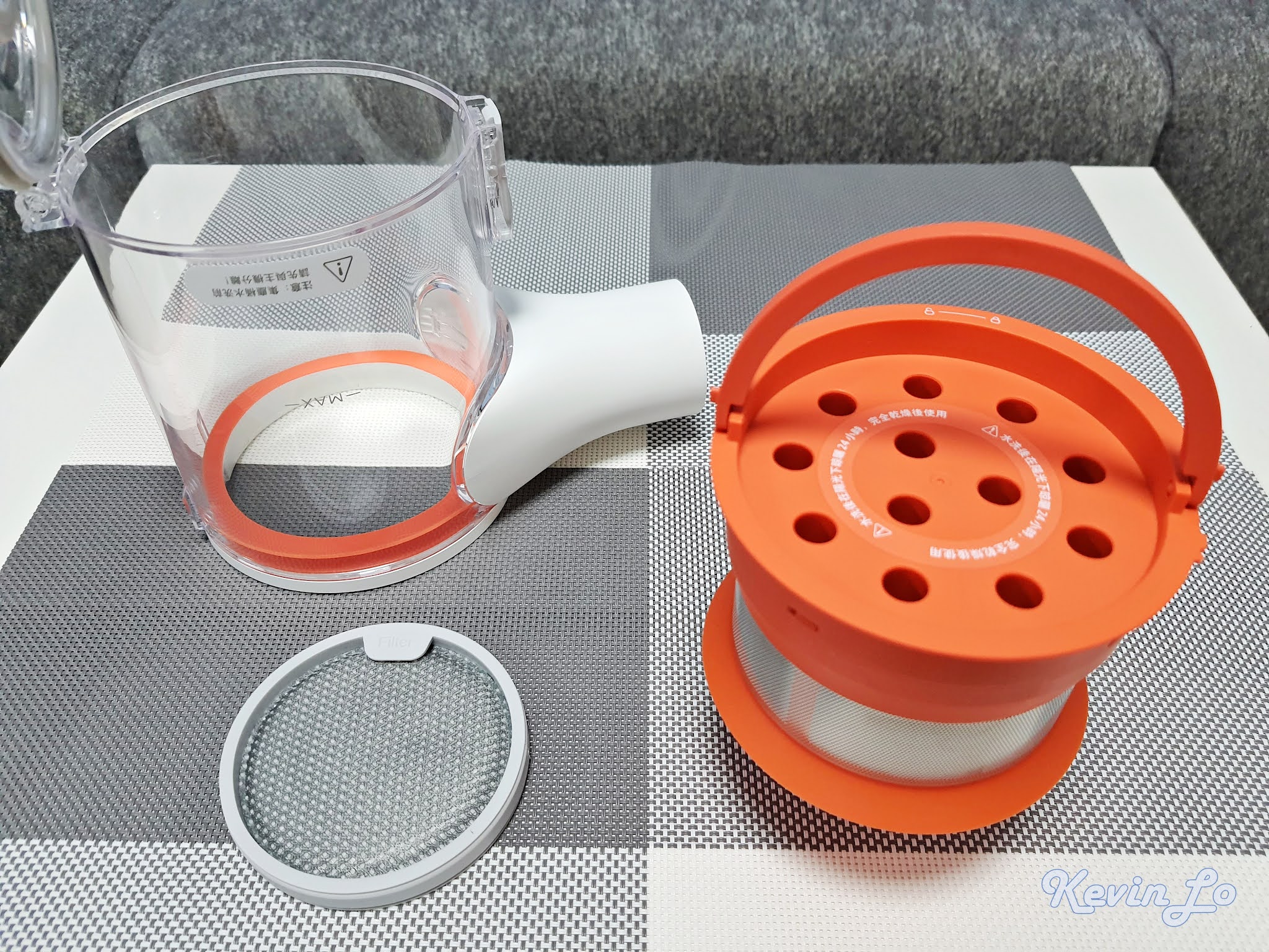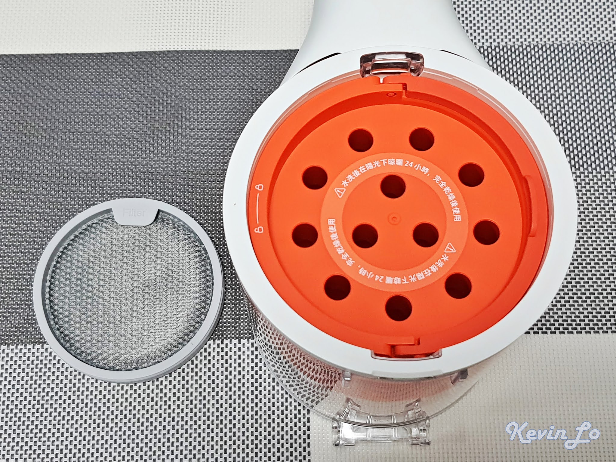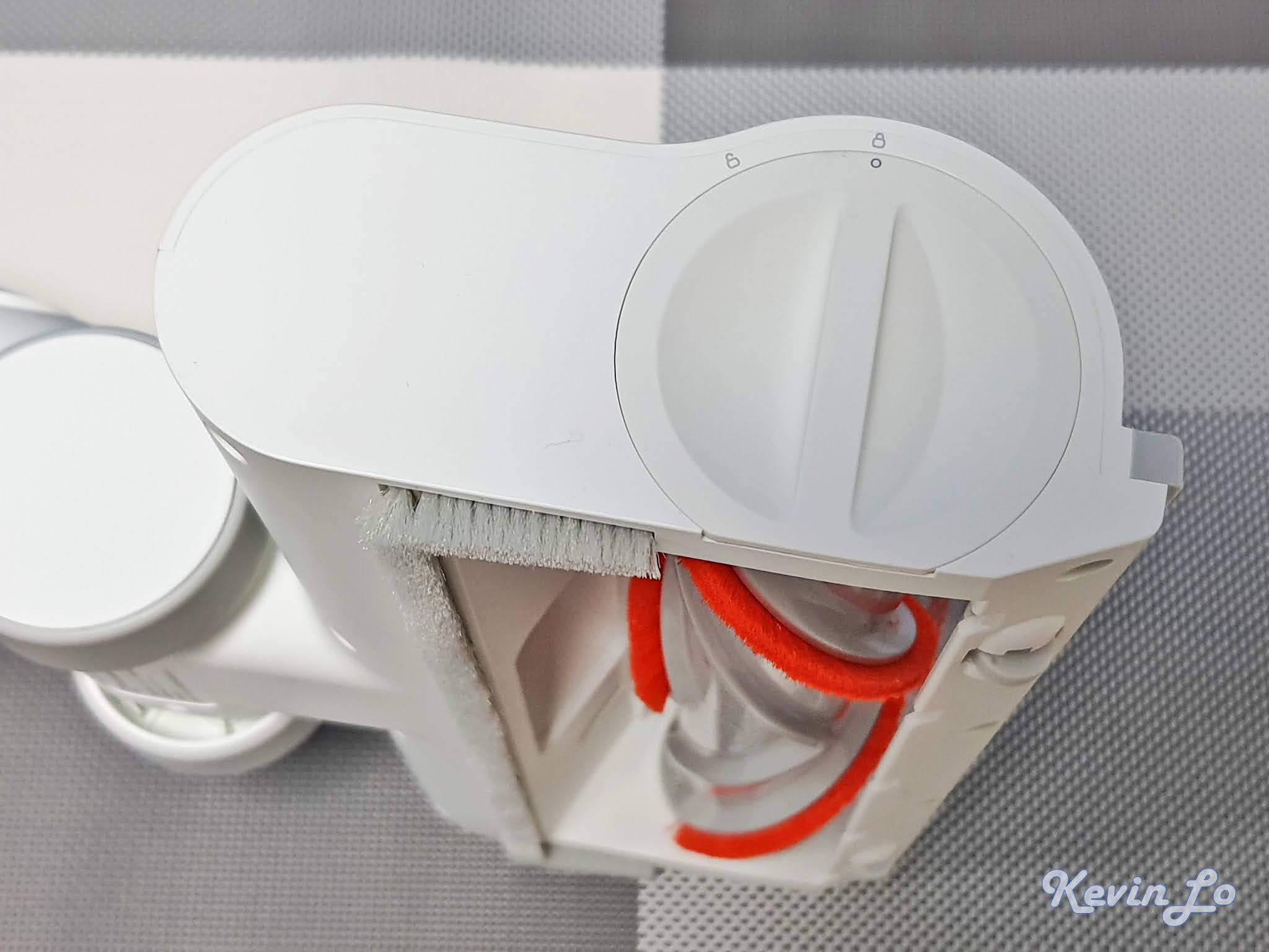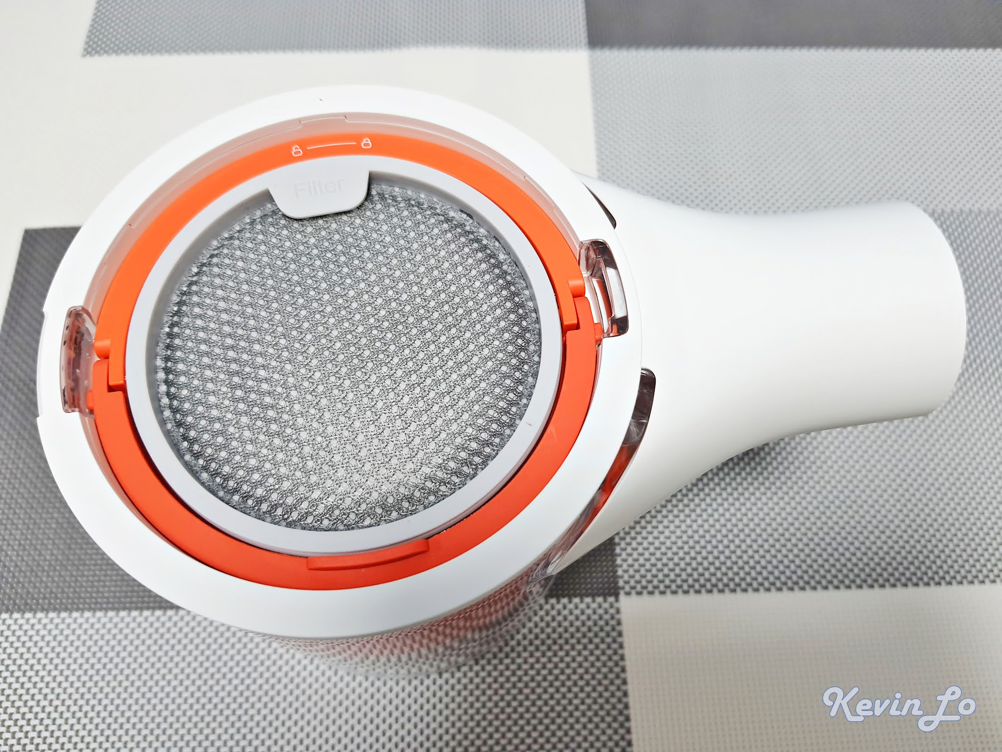 集塵桶頂部為一前置過濾網, 避免灰塵從出風口噴出, 正面印有 “Filter” 字樣.