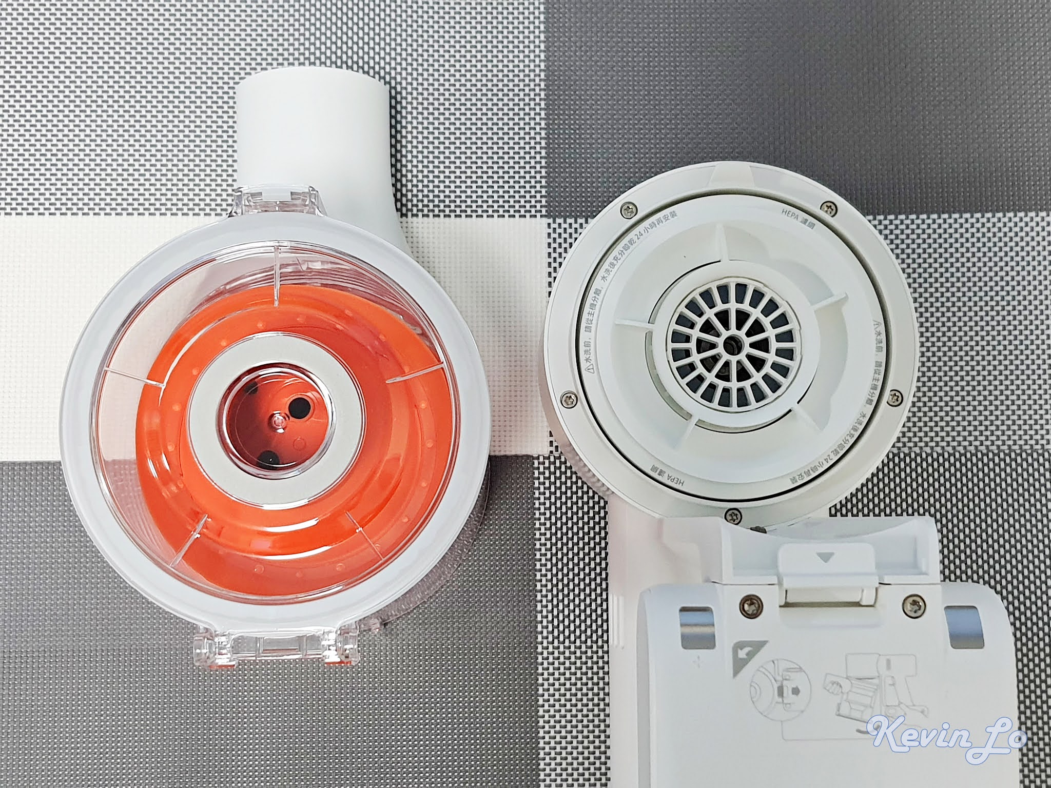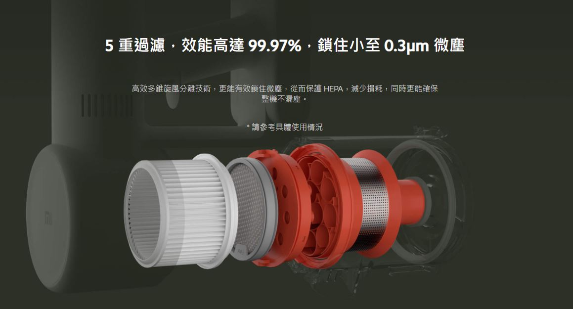 一台吸塵器除了考慮外型之外, 最重要的是考量清潔能力, 【米家無線吸塵器 G9】的橘色旋風系統元件設計 5 重過濾, 有 99.97% 過濾效率與 99% 除蟎率, 金屬過濾網阻隔較大灰塵與毛髮, 12 錐旋風元件透過小氣旋產生離心力, 藉此過濾小灰塵, 減少灰塵量進入 HEPA 濾網造成負擔, 並增加 HEPA 過濾網的使用壽命.