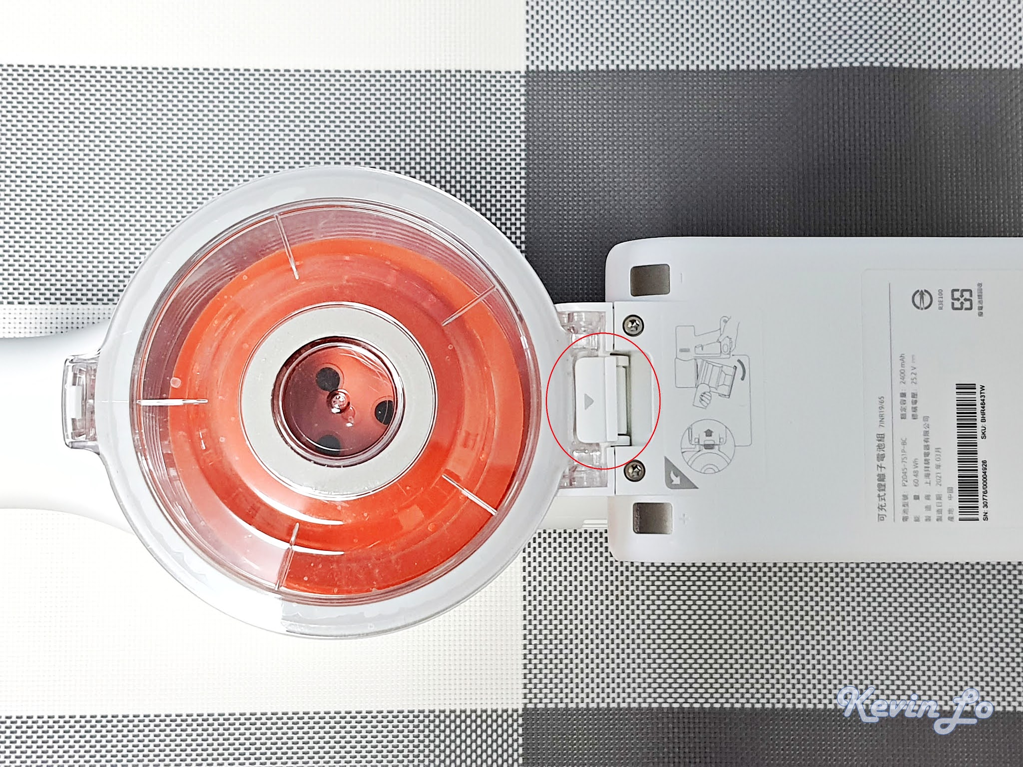 【米家無線吸塵器 G9】採用一鍵快速倒塵設計, 按壓集塵桶上的灰色按鈕, 集塵桶下方底蓋會自動彈開, 可將灰塵倒進垃圾桶, 如此雙手不會接觸到汙垢.