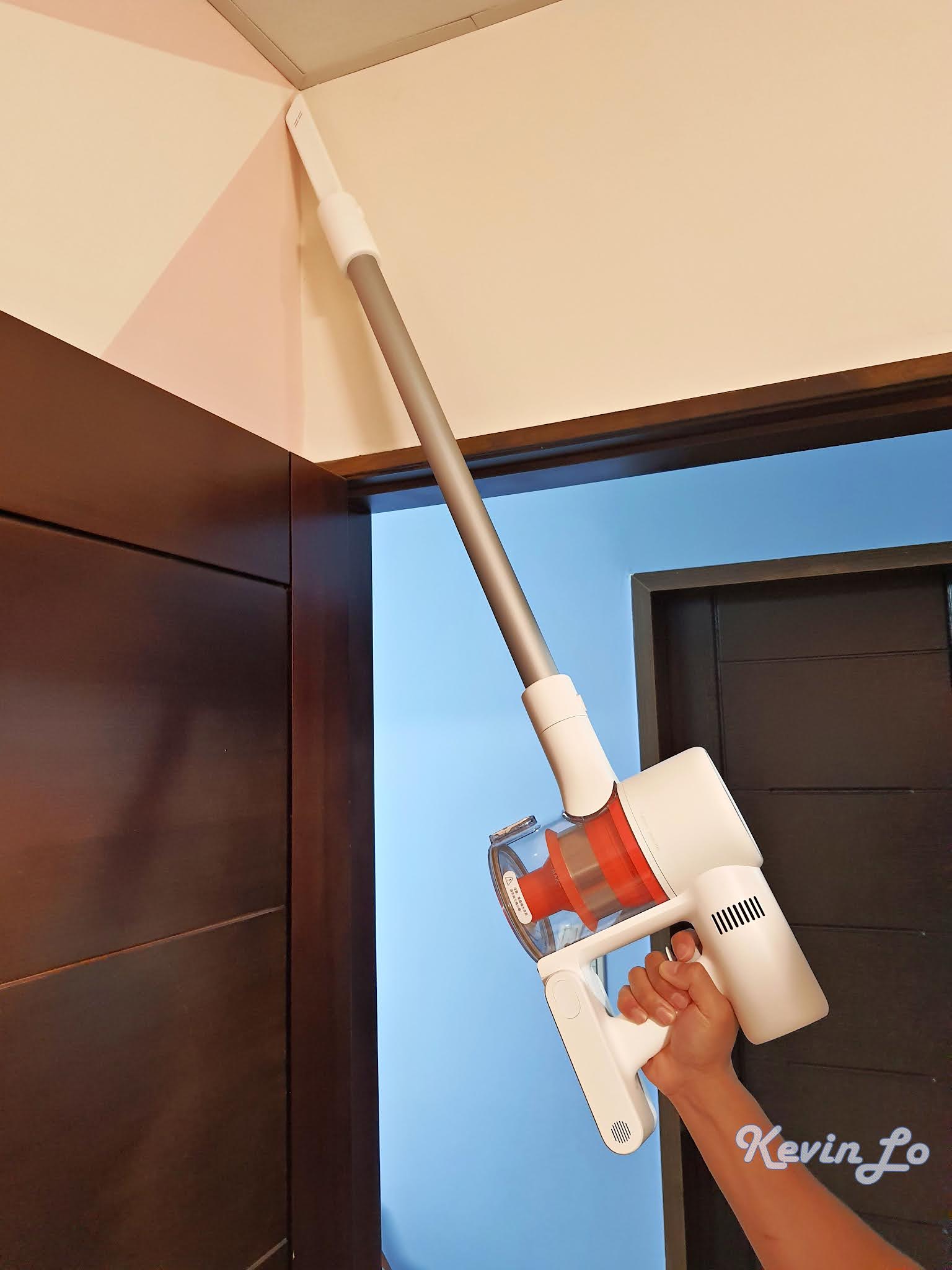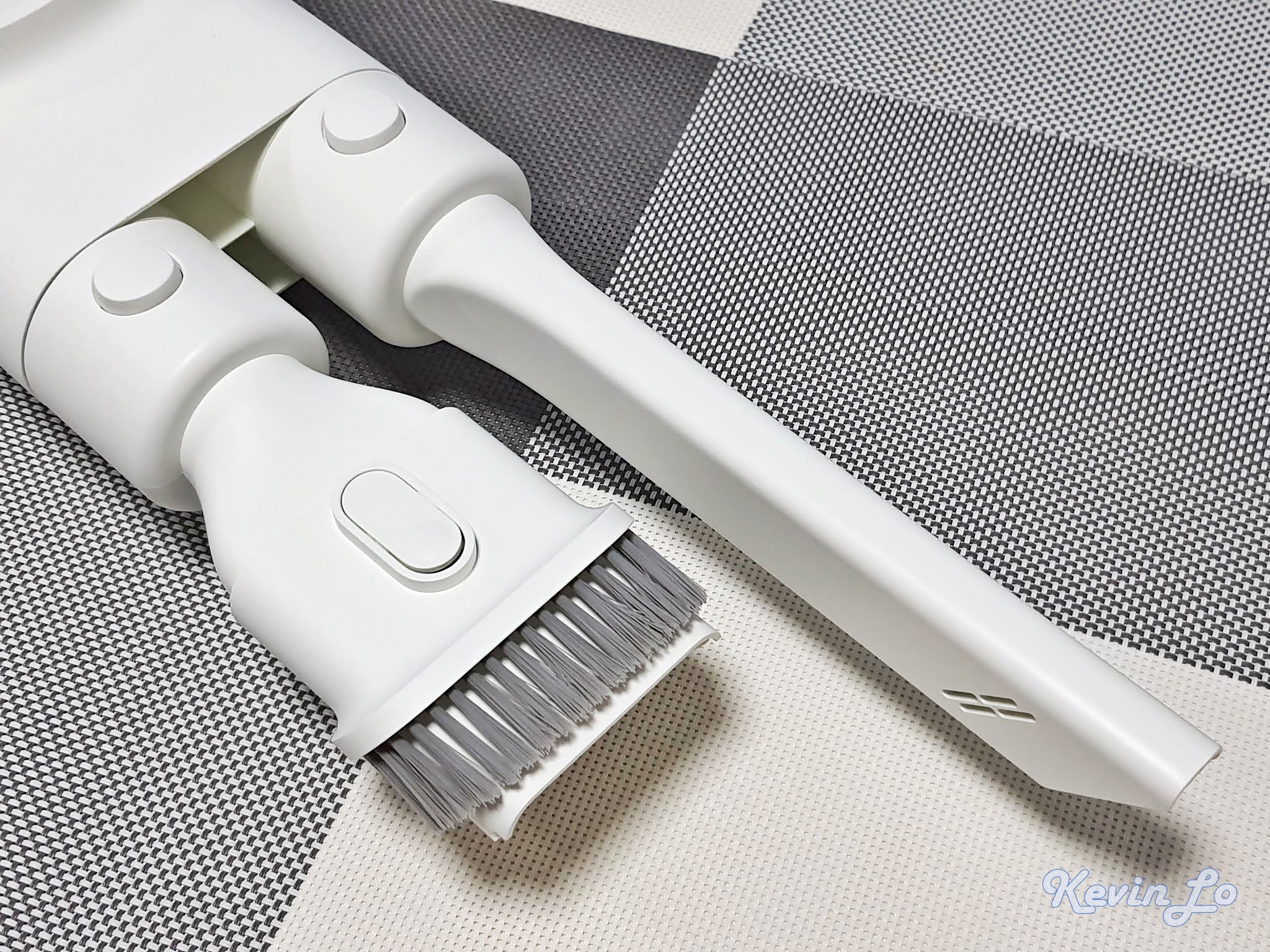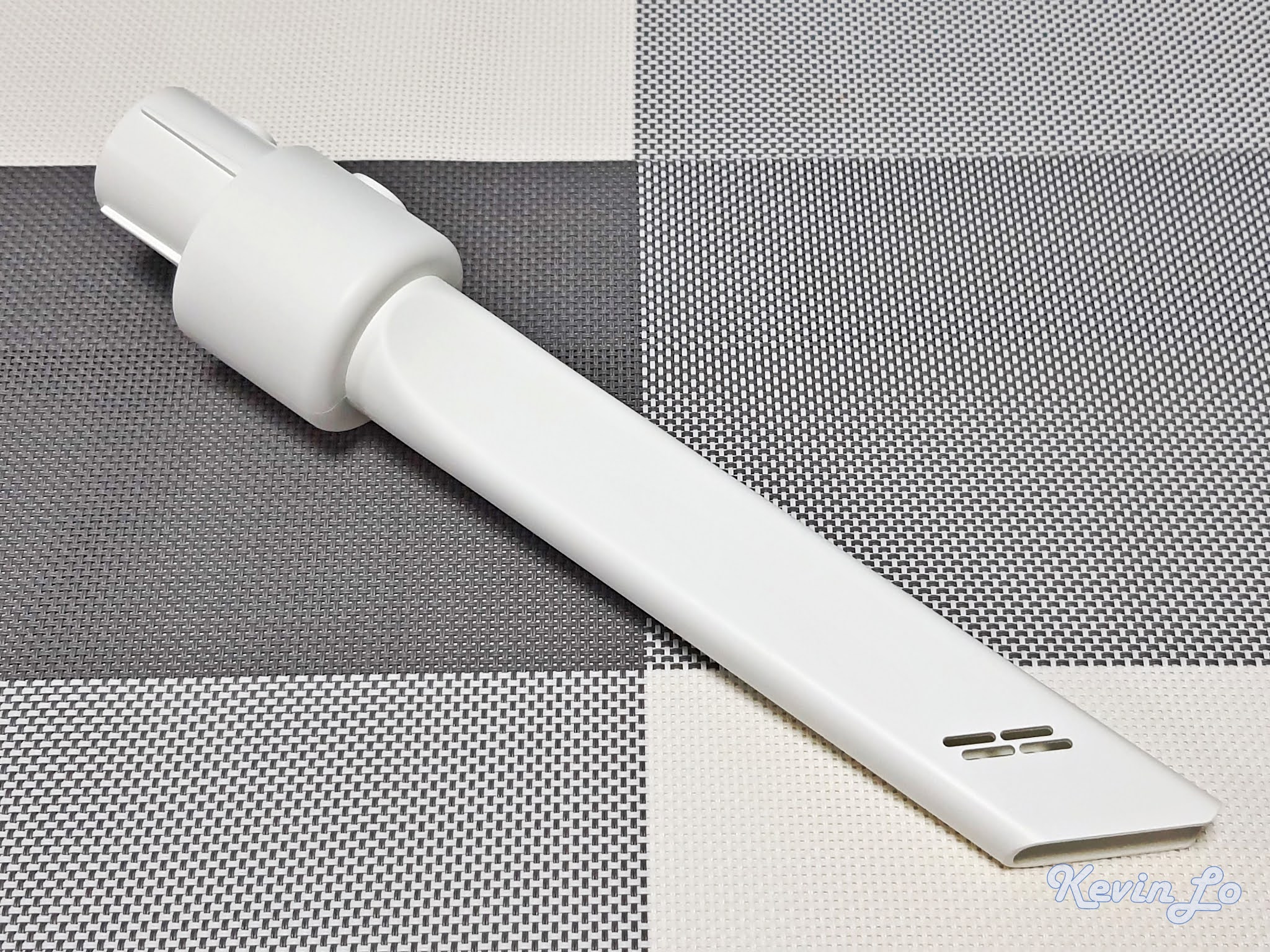 「縫隙吸頭」搭配延長桿, 加上無線式設計不受電線長度的限制, 適合用來清理狹窄門窗縫與牆角高處等地方, 不過機身整體重量有 3.6 公斤, 單手使用久了還是會酸.