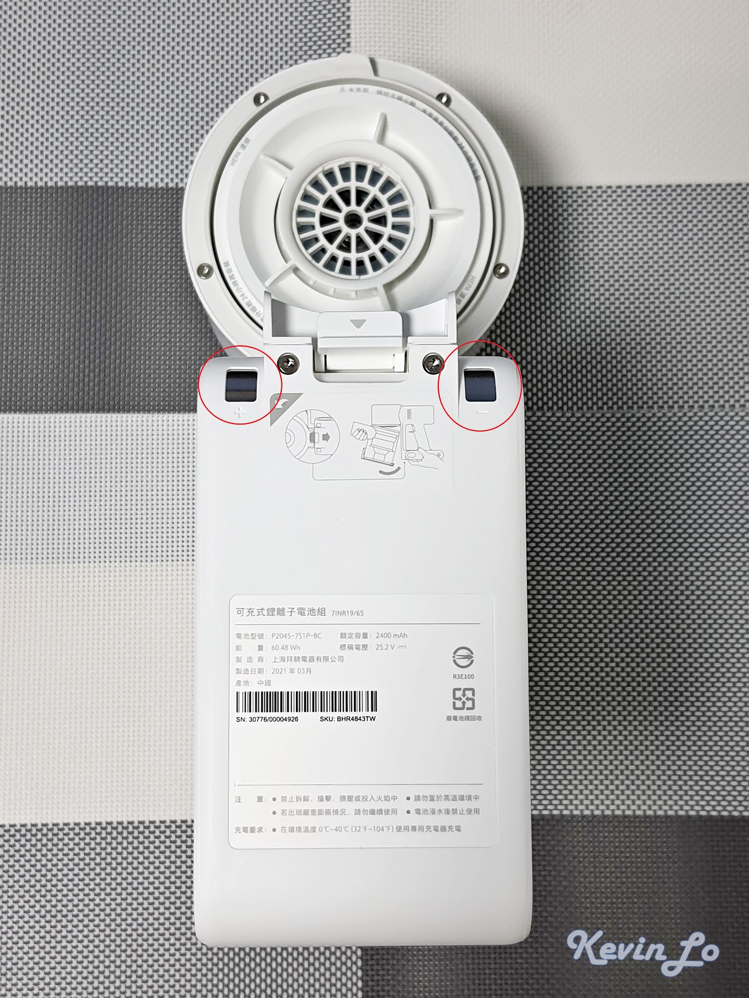 主機底座是電池的位置, 可以看到電池資訊與序號條碼, 電池容量顯示 2400mAh, 而電池的總量是 60.48Wh.