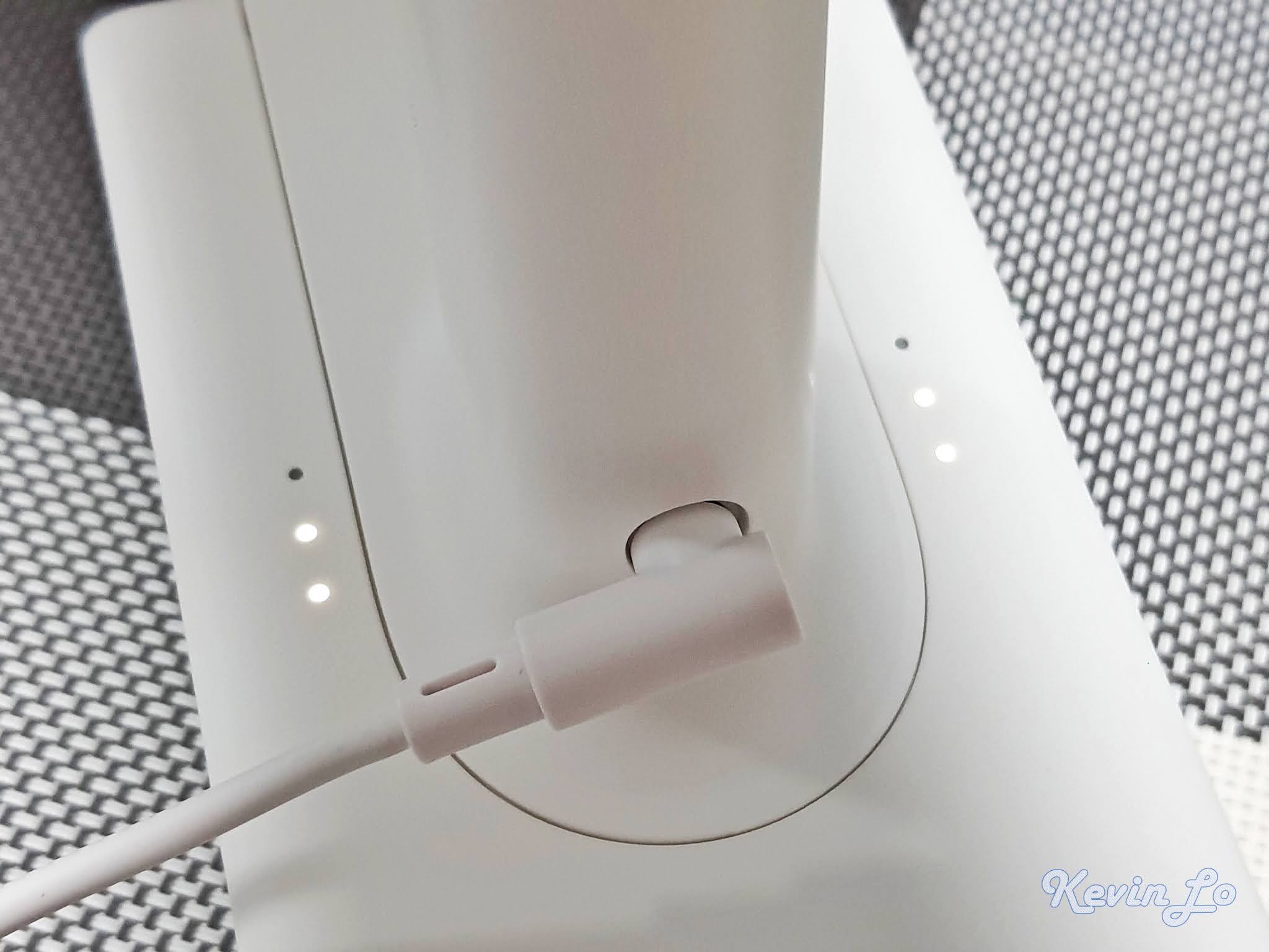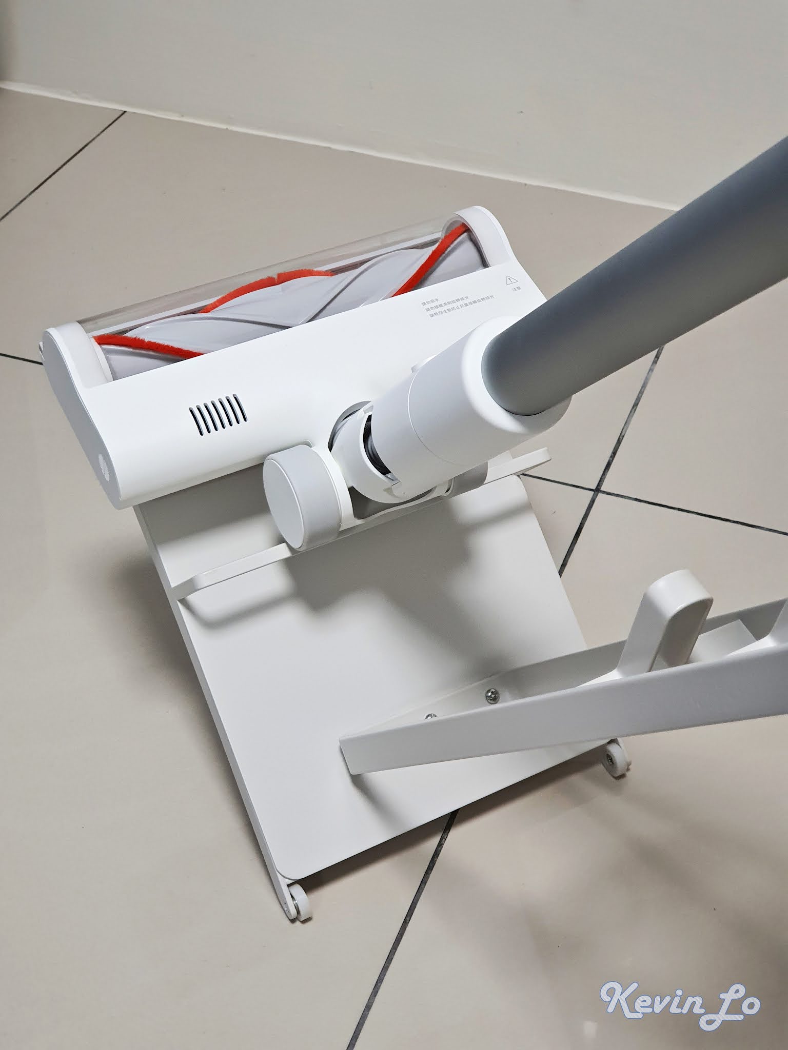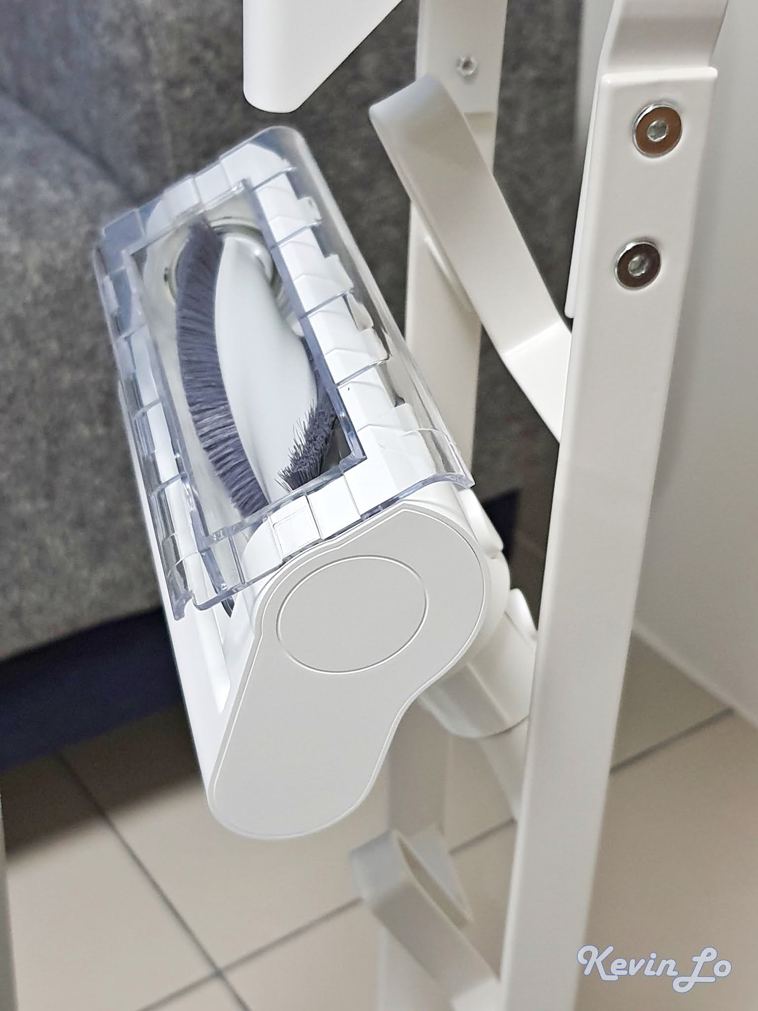充電收納二合一支架下方有兩個收納座, 可以放置閒置的吸頭, 我覺得放置「二合一毛刷」與「縫隙吸頭」比較適合, 若是放置「迷你塵蟎吸頭」就顯得卡卡的.