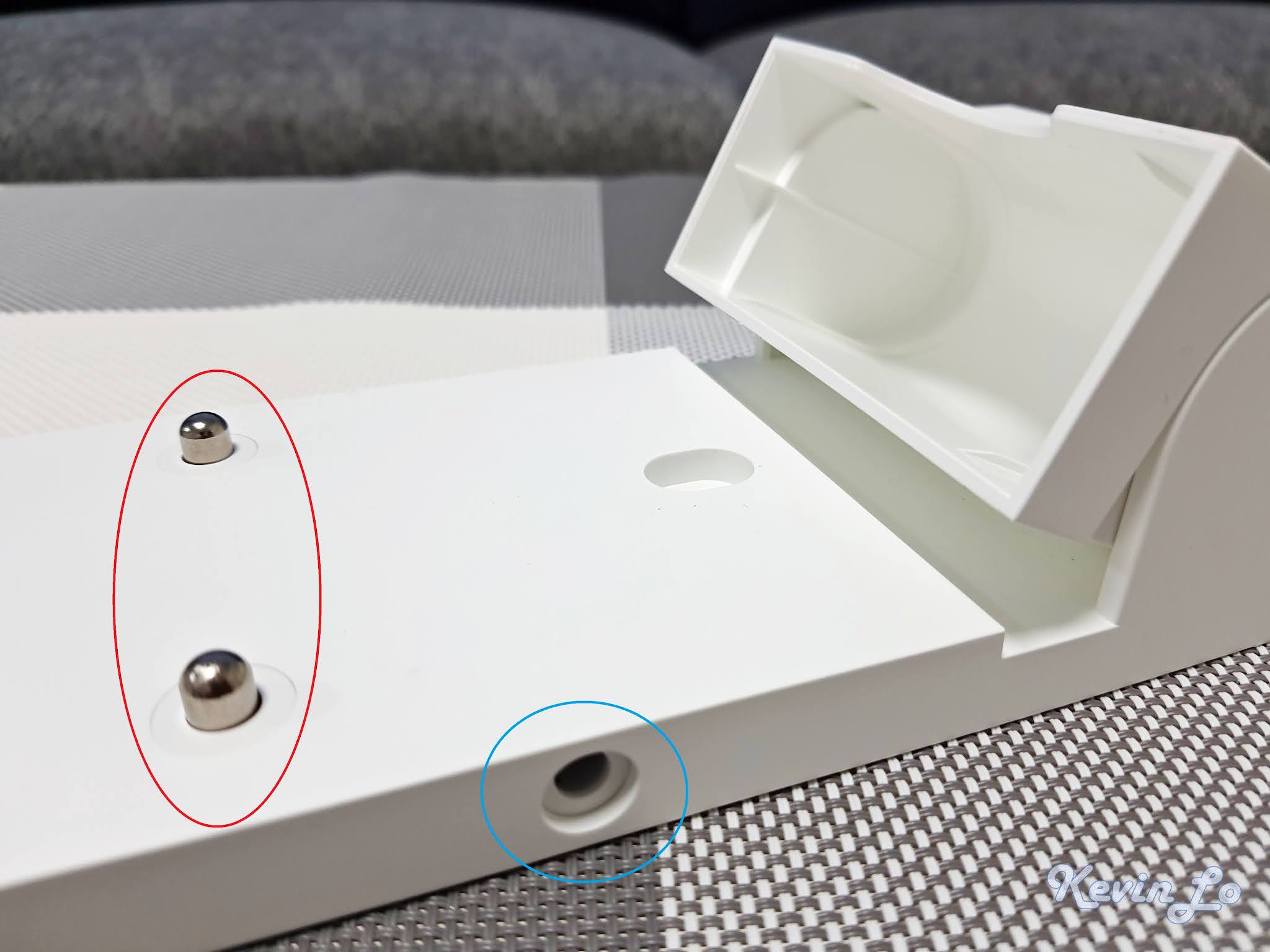 當主機放置架上時, 兩個突起的金屬接點 (紅圈處) 會對應到主機本體電池底部的電極片, 側邊有個電源孔 (藍圈處), 將電源供應器連接到此處, 就可以對主機本體進行充電.