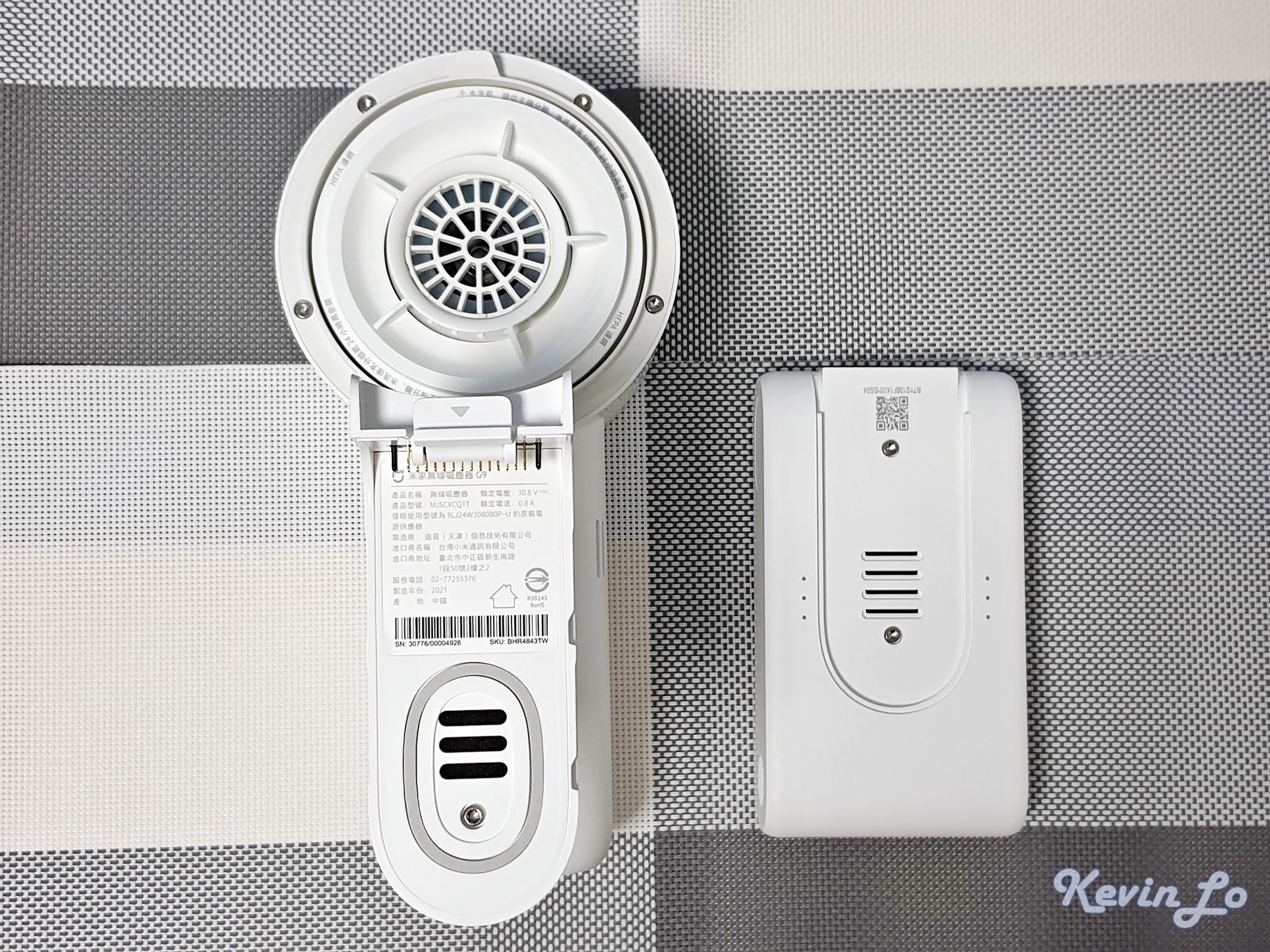 取下電池組可看到產品資訊與序號條碼, 及主機與電池組的通風口.