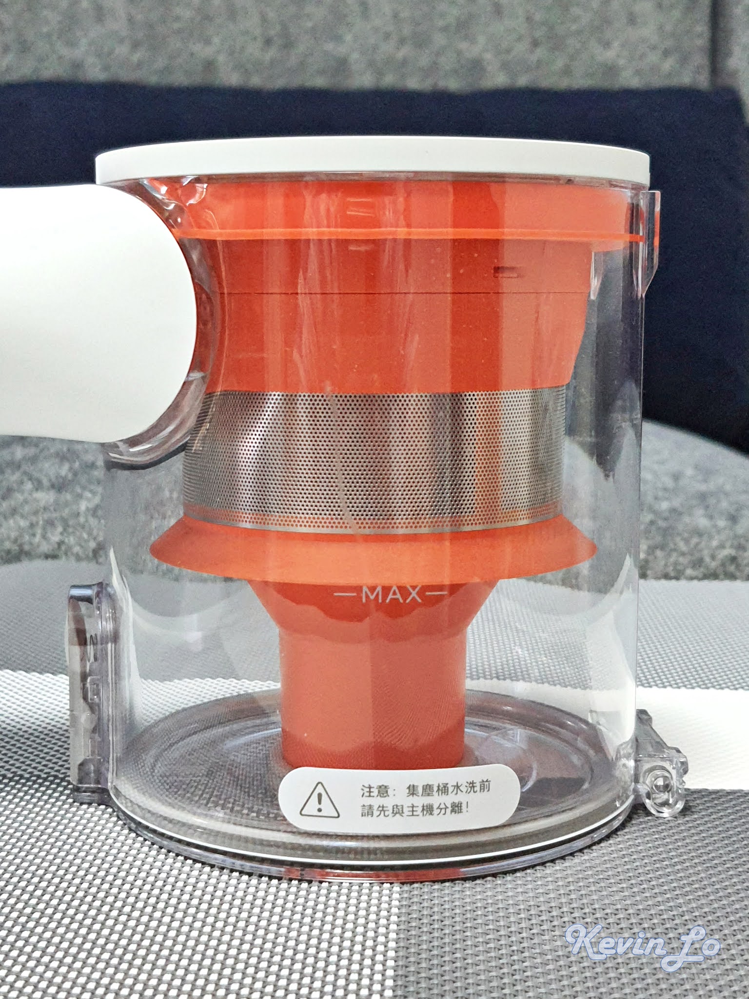 【米家無線吸塵器 G9】的透明集塵桶容量有 0.6 公升, 集塵桶有個 “MAX” 標示, 代表最大集塵量, 當桶內灰塵量到此處時就要倒掉, 避免影響吸塵效果.