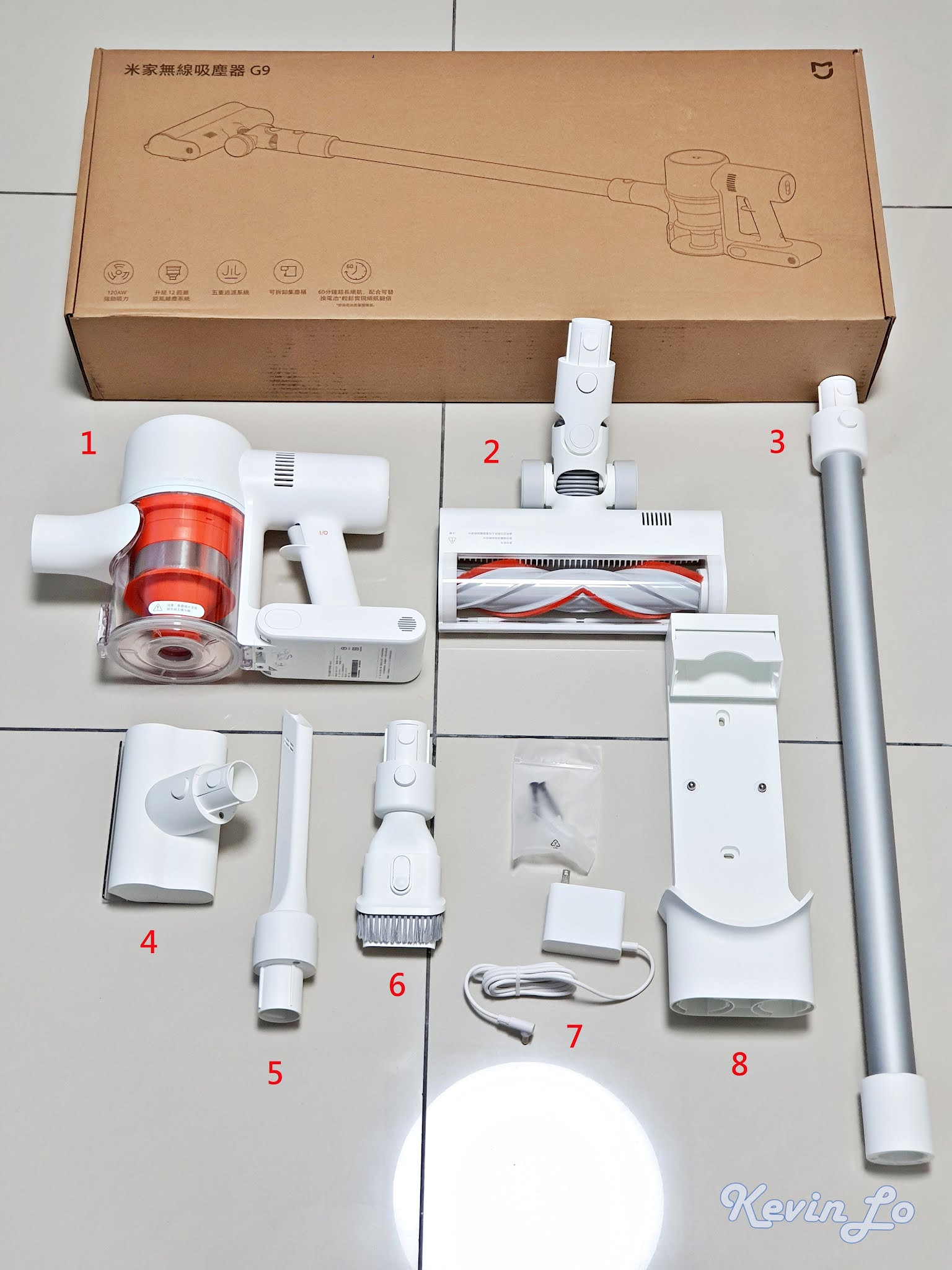 產品配件清單有: (1) 米家無線吸塵器 G9 主機 、(2) 高扭力地刷、(3) 延長桿、(4) 迷你電動刷頭、(5) 縫隙吸頭、(6) 二合一毛刷、(7) 電源供應器、(8) 充電收納二合一支架.