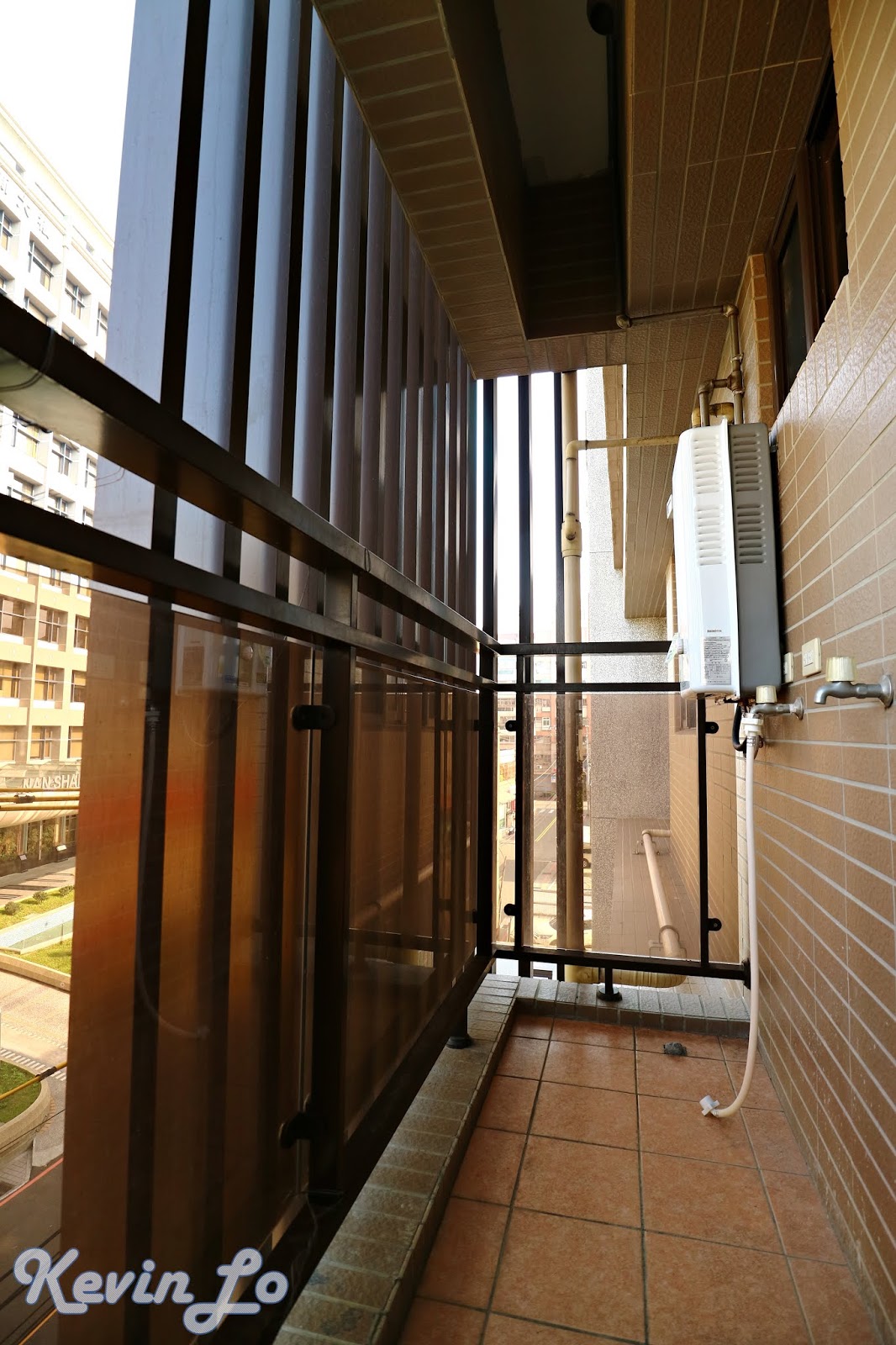 主陽台安裝了電熱水器, 同時接上洗衣排水管.