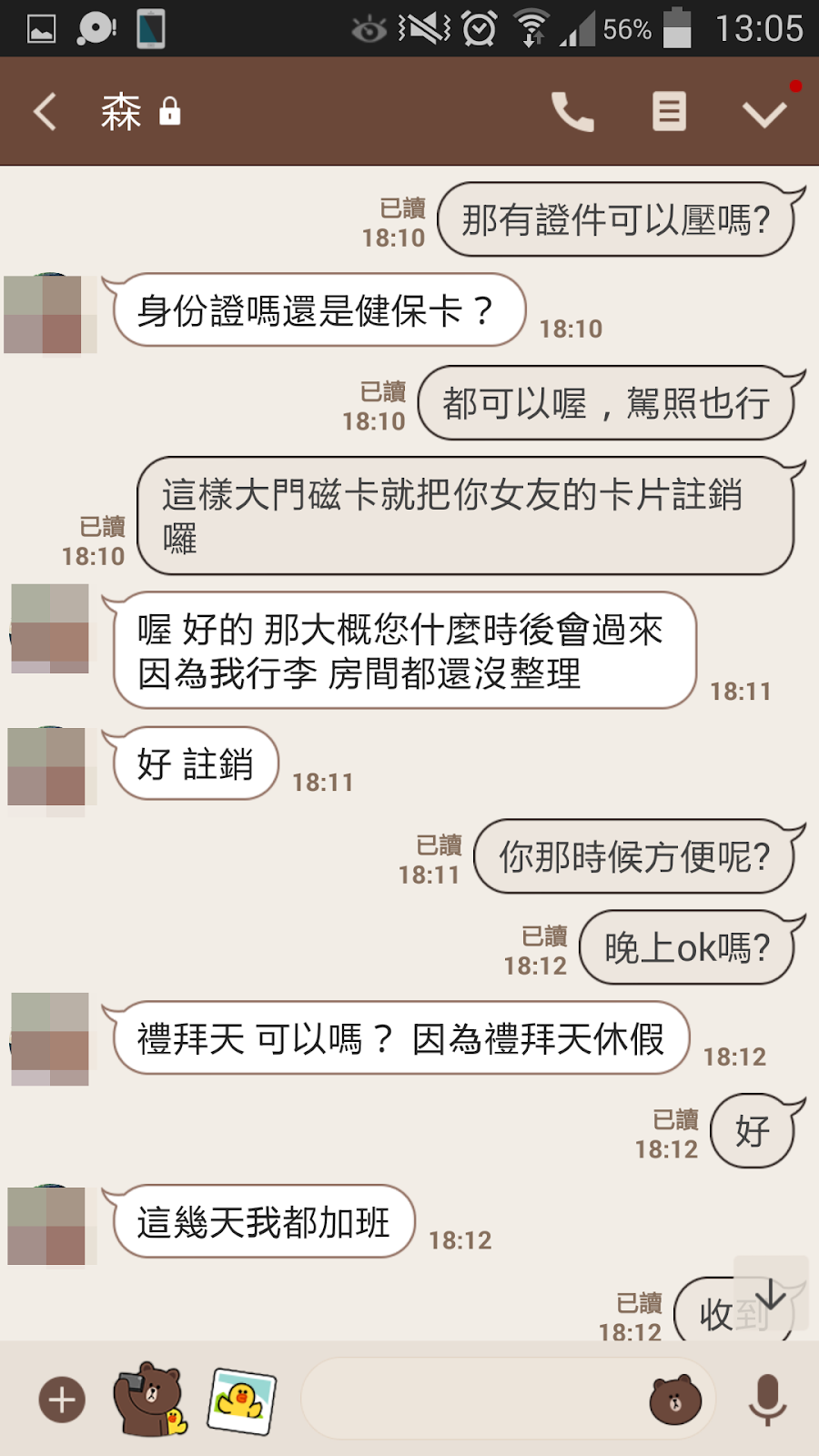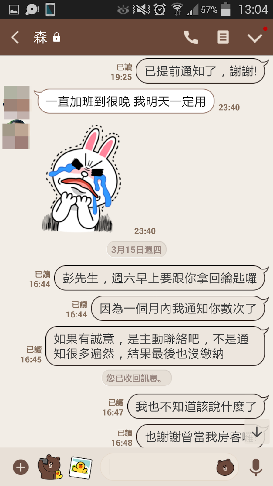 後來, line他的訊息根本就不讀不回, 剩下7000多元的房租也只好認賠了!