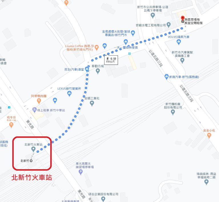 北新竹火車站與租借場地的距離約 450 公尺, 走路約 6 分鐘.