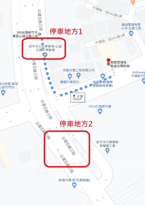 關於停車的問題, 可以將愛車停在橋墩下, 如下圖標示的兩個地方, 停車場與租借場地的距離約 120 公尺, 走路約 2 分鐘.