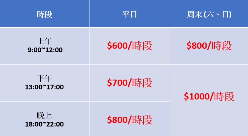以上時段皆可以彈性配合活動調整開始及結束時間, 開始前半小時與結束後半小時以內不計費.