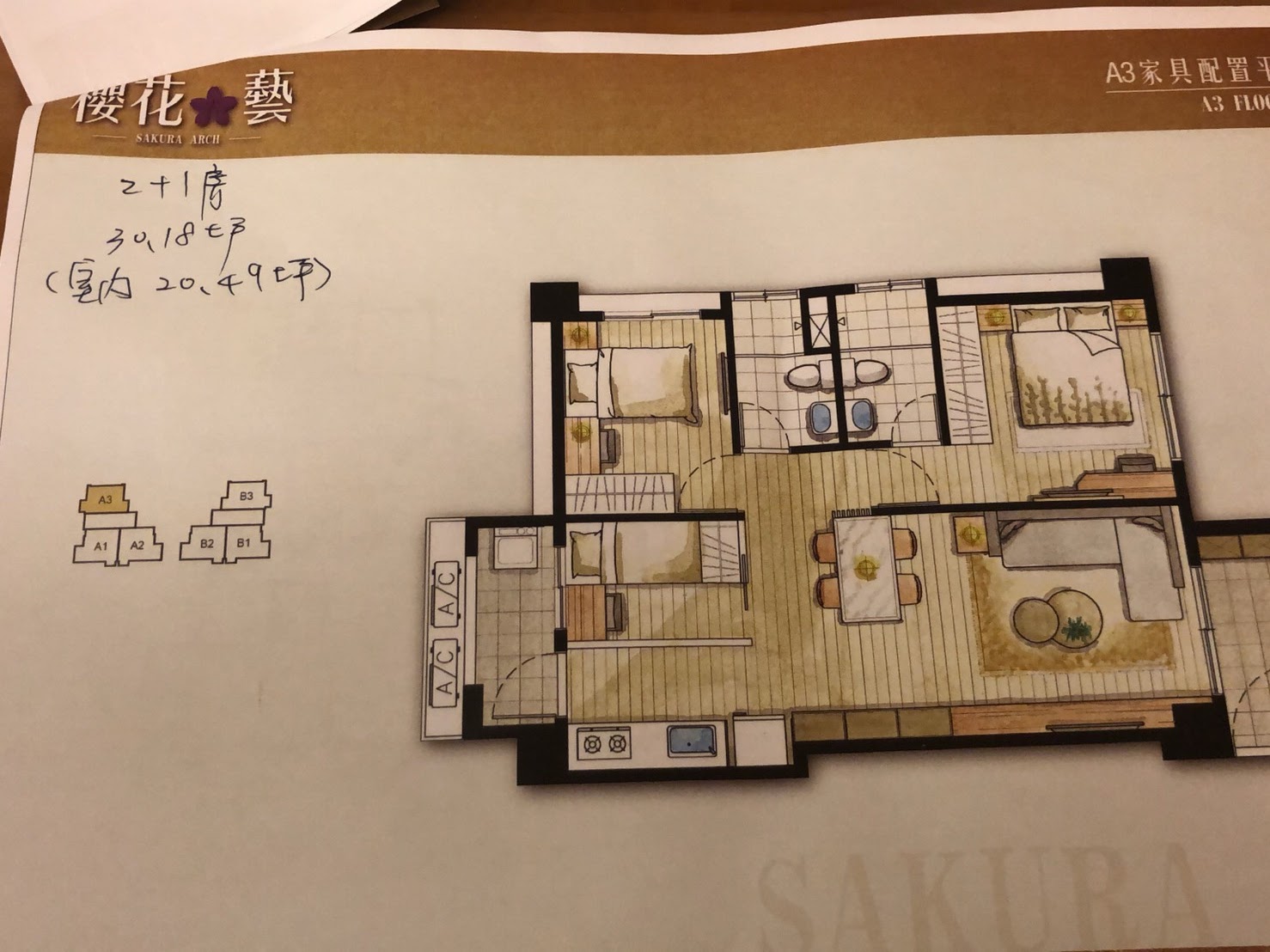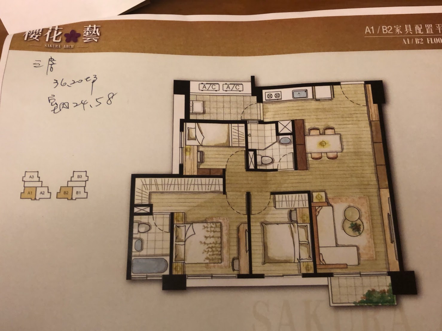 [坪數規劃]: 正 3 房 (36.20 坪, 室內 24.58 坪)、小 3 房 ( 2+1 房) (30.18 坪, 室內 20.49 坪)
