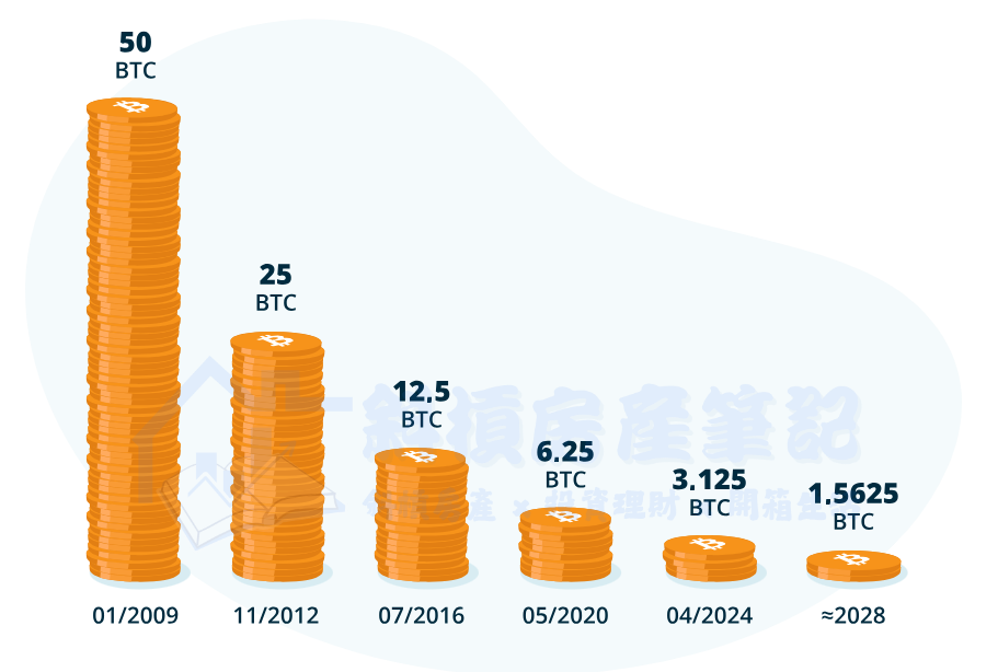 大約每四年(每產生 21 萬個區塊後),礦工挖到新區塊的獎勵就會自動減半。