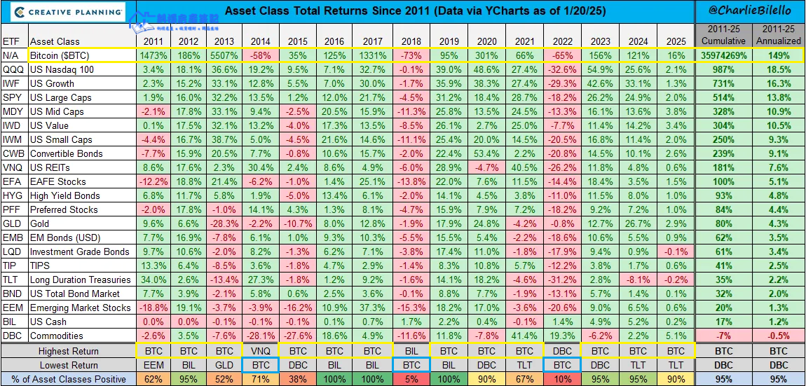 下圖由美國理財顧問機構 Creative Planning 製作,整理出 2011 至 2025 年主要資產類別的年度報酬率比較表(Asset Class Total Returns):