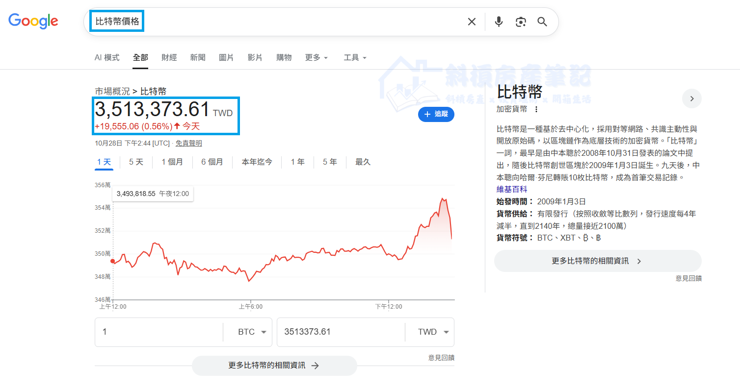 - 步驟 3:Google 會顯示即時的比特幣價格,通常會顯示美元價格和一些基本的市場指標。