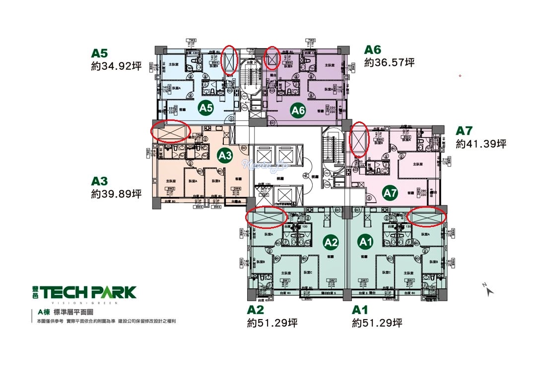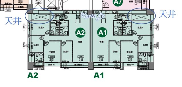 ● A1 為 A 棟最大坪數, 面南與面公園 (東曬) 之三面採光, 最大的採光天井, 四房三衛房型, 衛浴皆有對外窗, 大陽台, 大門開門位置的地方可以做玄關, 主臥室與臥室 A 門對門, 臥室 C 房門稍微對到衛浴門.