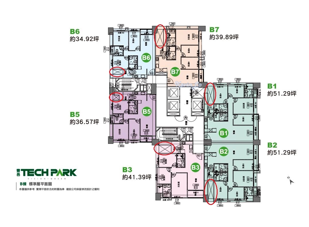 ● B1 為 A 棟最大坪數, 鄰近電梯與逃生通道, 面北與面公園 (東曬) 之三面採光, 最大的採光天井, 四房三衛房型, 衛浴皆有對外窗, 大陽台, 大門開門位置的地方可以做玄關, 主臥室與臥室 A 門對門, 臥室 C 房門稍微對到衛浴門.