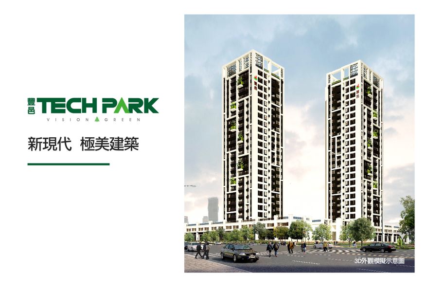 這次豐邑建設聘請台灣最頂級豪宅 – 陶朱隱園的建築設計團隊著手打造, 讓「Tech Park」有如台北信義區的陶朱隱園, 外觀設置綠化陽臺露臺, 打造這座「會呼吸」的城市垂直森林建築, 透過植物可以吸收二氧化碳與灰塵, 製造氧氣與濕氣; 在夏天可形成遮陽, 協助過濾髒空氣, 在冬天隔冷保暖與通風, 減少建築物內能源消耗, 重點是還能讓房價升值.